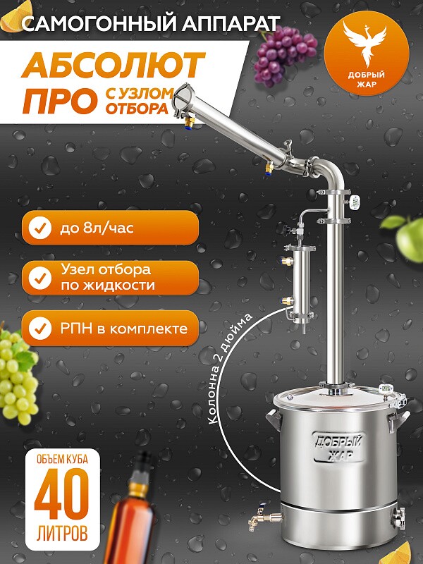Абсолют ПРО - это улучшенная версия легендарного аппарата Добрый Жар "Абсолют". Современный аппарат, отвечающий всем потребностям искушенного винокура. Двухдюймовая колонна с мощной 7-трубчатой системой охлаждения перегоняет брагу со скоростью до 7 литров в час. Фитинг-зажимы для удобного подключения воды и съемный носик с ТСА, направляющий поток дистиллята и предотвращающий захлеб колонны. Узел отбора по жидкости позволяющий без особых усилий произвести дробную перегонку с отбором "голов", "тела" и "хвостов".